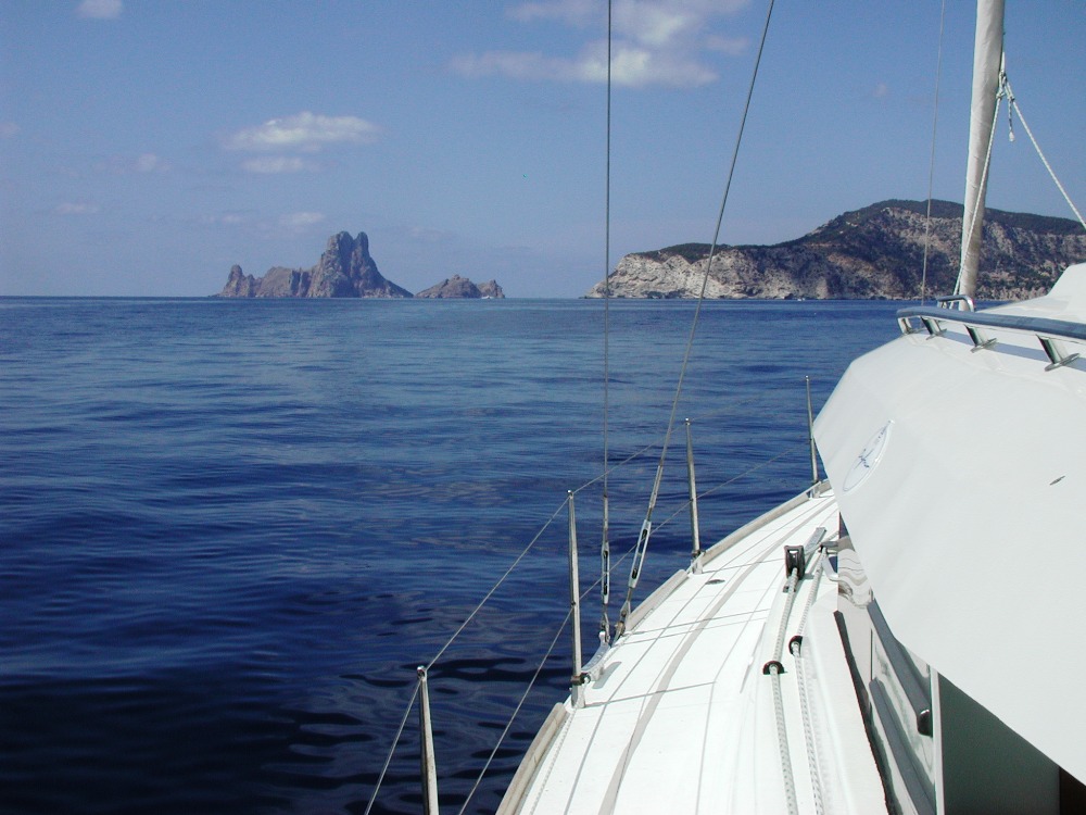 Nach einem ruhigen Flug, bei dem wir über das ganze Flugzeug verteilt sind, landen wir um ca. 21:45 in Ibiza. Das Transfertaxi ist natürlich nicht mehr da, läßt sich aber telefonisch noch herbeiordern, sodaß dem Transport zum Schiff nichts im Wege steht. Es ist ein tolles Boot, ein Seniorengleiter, ein Pensionistensegler, nur, daß wir alles knackige junge Männer sind, aber Gegensätze ziehen sich an.