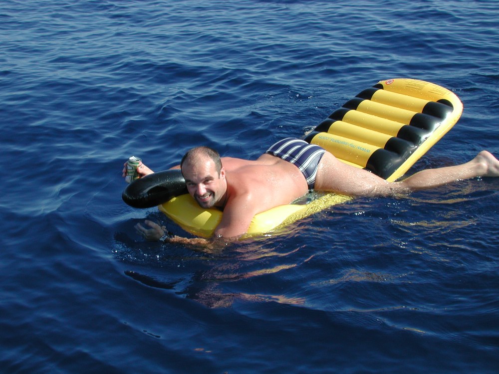Als wir auslaufen, regt kein Lufthauch das Segel und nach einigen Meilen Getucker machen wir die erste Schwimm- und Entleerungspause. Dabei läßt sich natürlich ein Manöverschluck nicht vermeiden. Im Dingi tummeln sich Willi und Gerhard bei Bier und Chips, der Rest liegt faul herum.